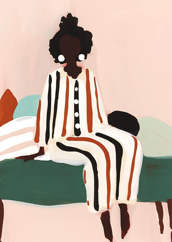 Affisch Målning av en kvinna som sitter på en säng med en katt i knät