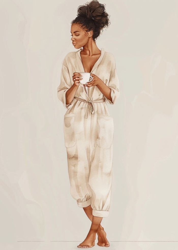 Målning av en kvinna i en mantel som håller en kopp kaffe