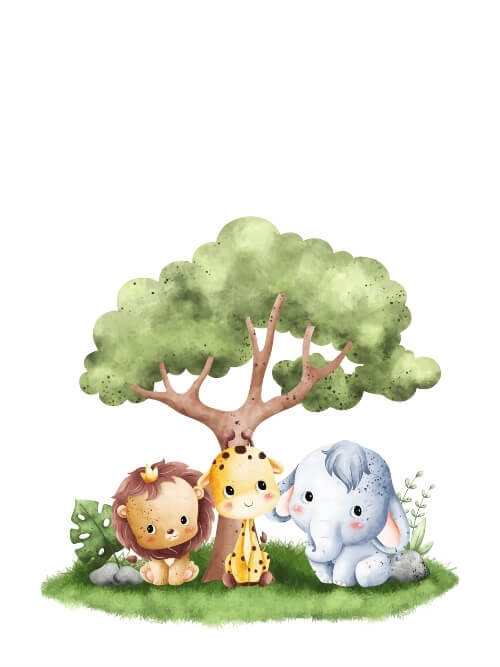 Skapa en sagostämning i ditt barns rum med denna affisch, där söta djurbebisar samlas i skuggan av trädet. Det kommer säkert att ge leenden och glädje till alla rum.