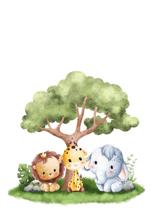 Skapa en sagostämning i ditt barns rum med denna affisch, där söta djurbebisar samlas i skuggan av trädet. Det kommer säkert att ge leenden och glädje till alla rum.