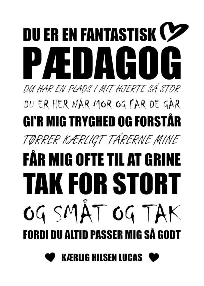 En unik och söt poster för den fantastiska pedagogen. Men ord och fraser som beskriver en lärares vardag. En perfekt present till exempel som avskedspresent när barnet ska börja skolan.