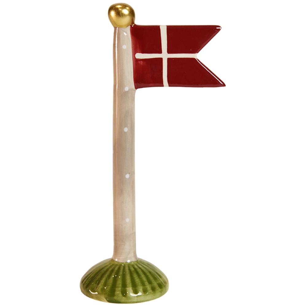Dekorativ flaggstång med röd dansk flagga, gyllene topp, grön bas, vita prickar, namnet "KASPER".