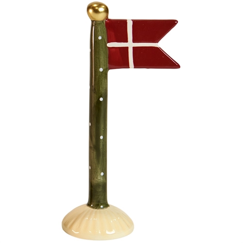 Grön stång med vita prickar, gyllene topp, röd flagga, "KASPER" vertikalt.