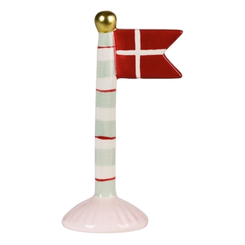 Denna handgjorda keramiska flagga med röda och vita ränder och en guldfärgad knopp kombinerar dansk tradition med personlig stil. Du kan få ett namn graverat på flaggstången, vilket gör den till en speciell present eller minnesvärd.