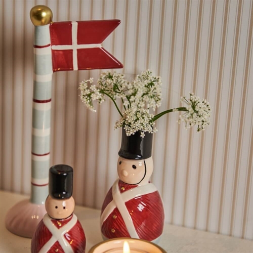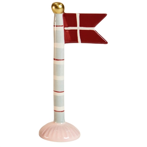 Keramisk flaggstång med dansk flagga, texten "PÆDAGOG", gyllene topp och ränder.