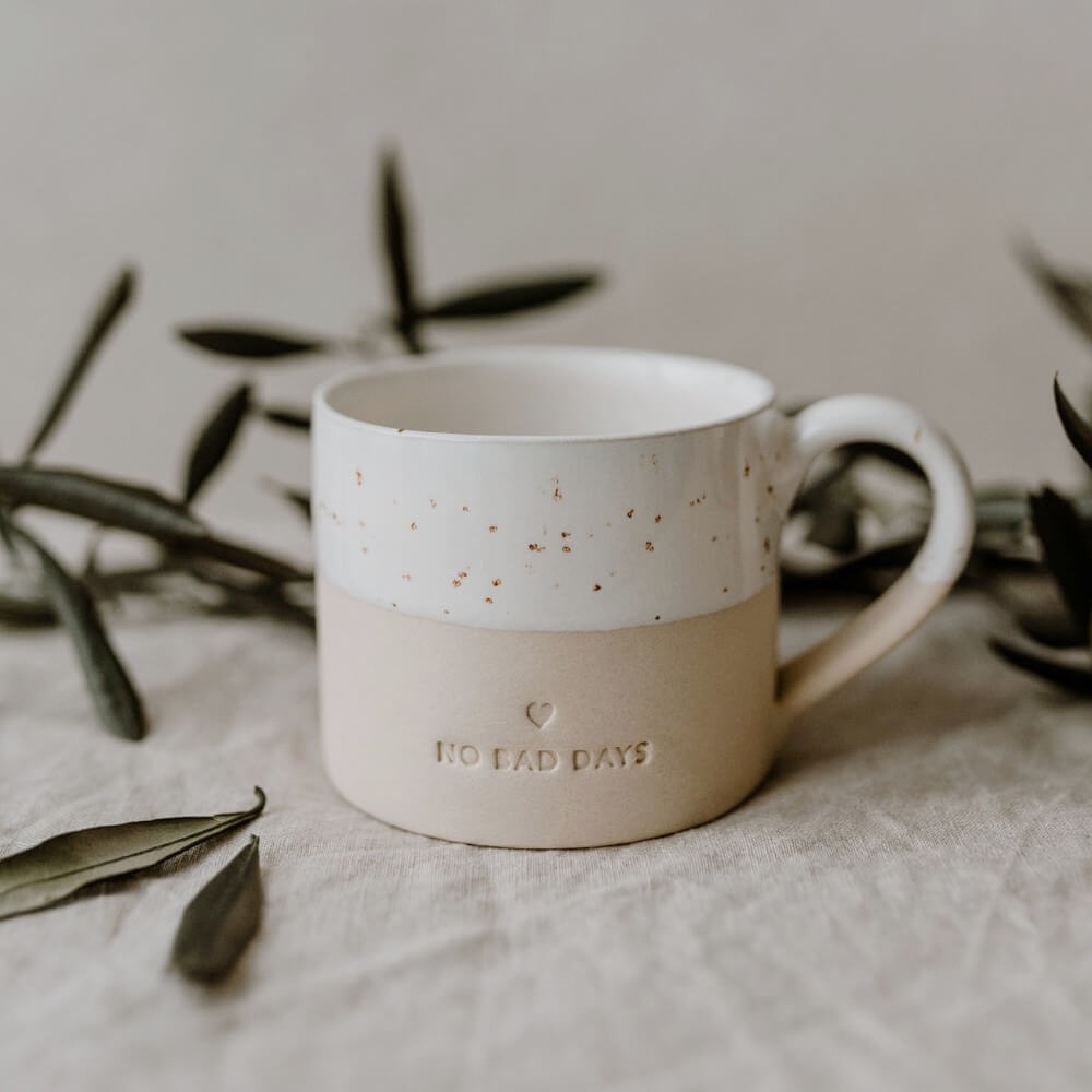 Börja varje dag med ett positivt budskap på din kopp. Den präglade texten NO BAD DAYS på den beige basen kommer att ge dig ett litet leende, medan den tvåfärgade designen med vita prickar på toppen skapar ett speciellt uttryck.