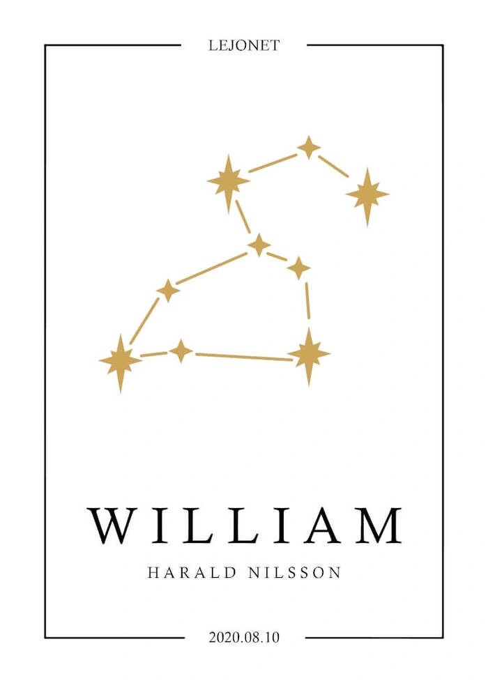 Er du på udkig efter en personlig og yderst stilfuld plakat til dine børn? Så skal du tage et grundigt kig på denne fantastiske plakat, som med sit enkle design vil passe perfekt ind i dit hjem, uanset hvor du vælger at hænge den op. Måske ønsker dine børn at have den hængende på deres værelser, eller måske hænger I dem samlet op i stuen. Plakaten viser et tegnet stjernebillede af stjernetegnet Løven, lavet af stjerner. Under tegningen er der plads til at skrive børnenes navne for at gøre den endnu mere personlig.