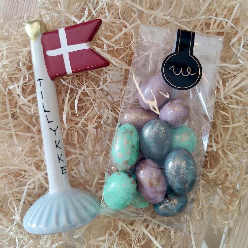 Lille gav med lyckoönskningsflagga - Råvit