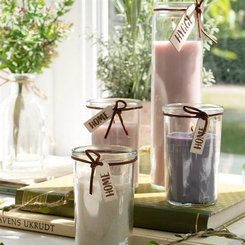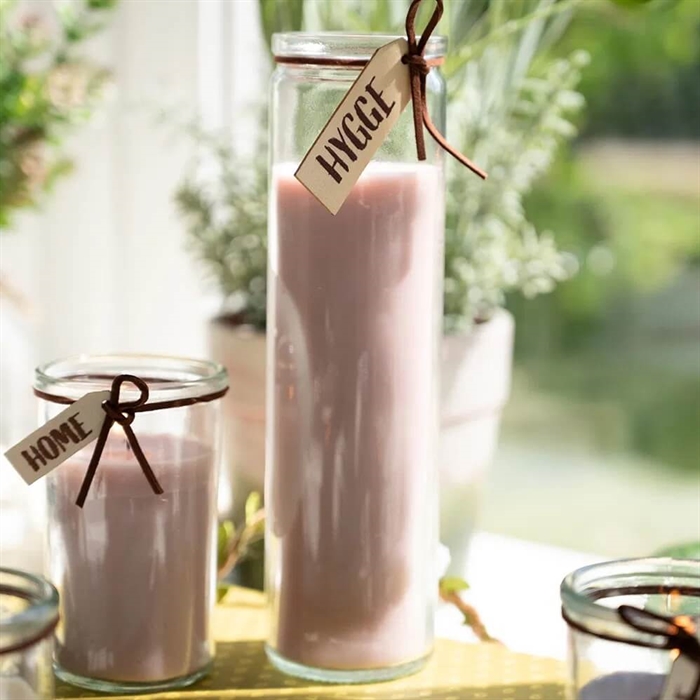 Du får ett set glasljus, ett med en höjd på 21 cm och det andra med en diameter på 10 cm. Färg: Rosa.