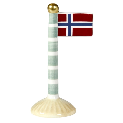 Keramisk flaggstång med norsk flagga, ränder, gyllene boll och texten "OLE" vertikalt på stången.