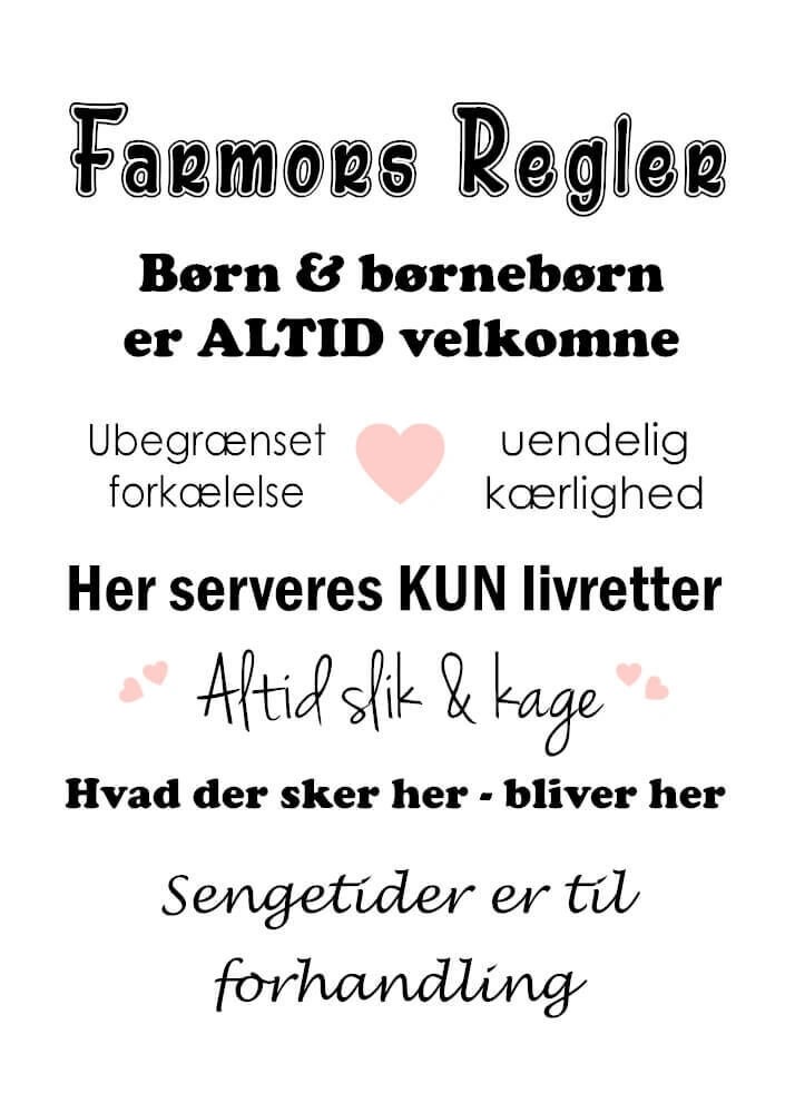 Denna söta och roliga poster innehåller mormors regler. Reglerna är gulliga och kärleksfulla och värmer garanterat din farmors hjärta. Har du en farmor som ger dig ändlös kärlek, serverar dina favoriträtter, skämmer bort dig med godis och kakor, som har förhandlingsbara sängtider och som alltid välkomnar barn och barnbarn? Så är denna poster en perfekt present som kommer att värma din farmors hjärta. Med denna poster visar du hur mycket du uppskattar din farmor och alla de minnen ni har skapat tillsammans.