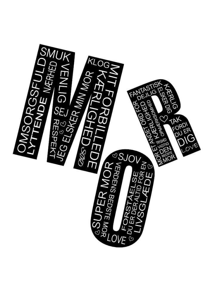 Posteren innehåller ordet MAMMA. Inne i bokstäverna står en massa vackra ord och meningar som kännetecknar en fantastisk mamma. Allt från jag älskar min mamma, klok, kärlek, snäll, min förebild, supermamma. Du designar själv din poster genom att välja mellan dessa bakgrundsfärger: vit, ljusgrå (som på bilden), mörkgrå. På det sättet kan du designa posteren, så den passar perfekt in i ditt mammas hem.