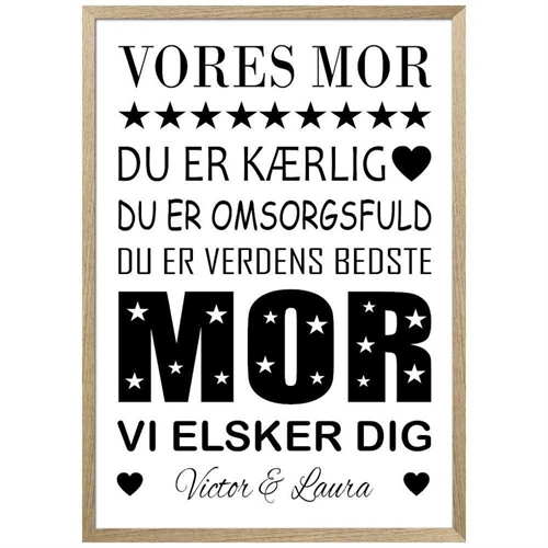 Personlig poster med barnens namn till deras kärleksfulla och omsorgsfulla mamma. Vill du göra något extra för din mamma för att hon är den bäste som finns? Då har du här möjligheten att köpa denna underbara poster till din mamma. En poster som denna kommer garanterat att värma hennes hjärta. Denna poster är en perfekt present, och om ni är en syskonskara kan ni få med alla era namn skrivna på posteren. Denna poster är en ytterst fin mors-dags present, födelsedagspresent eller som spontan present. Posteren är i fina dämpade färger. Texten är skriven med olika teckensnitt, viket ger en dynamisk effekt i designen. Runt om på posteren är det små fina stjärnor och inte minst söta hjärtan som förstärker textens budskap.
