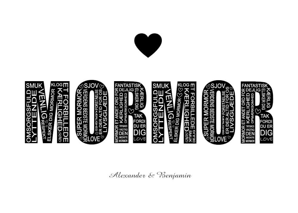 Letar du efter världens bästa present till din mormor? Så behöver du inte leta längre. Här har vi en härlig poster som betonar den stora kärleken till din mprmor. Designet är stilrent och elegant och passar säkert perfekt in i din mormors hem. Ordet mormor står skrivet med fet stil och inne i Mormor-bokstäverna står underfundigt gömda en massa fina ord. Ord som kännetecknar dina känslor för mormor så som en förebild, rolig, fantastisk, vänlig och många fler. Under texten Farmor kan du skriva era egna namn med en fin font. Det kan eventuellt vara namn på dina barn eller ditt eget och dina syskons namn, vilket personaliserar denna fantastiska poster. Namnen skriver du efter att du har valt färg och storlek.