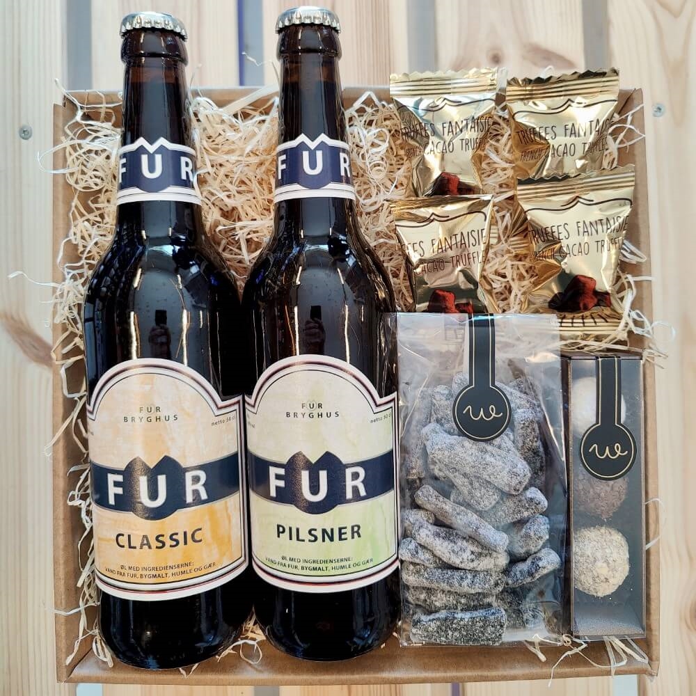 Denna presentkorg kombinerar två olika Fur-öl med godis. Du får både Classic och Pilsner från det danska bryggeriet Fur tillsammans med lakrits och choklad.