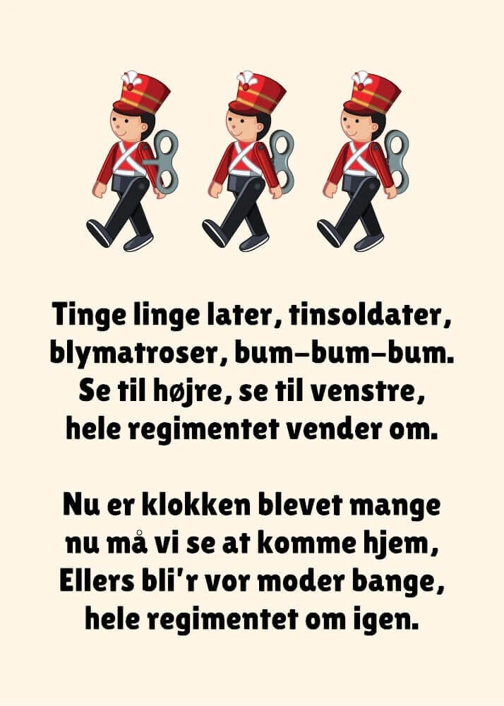 Söt barnposter med den välkända barnvisan Tinge-linge-later, tennsoldater. Denna poster har en ljusblå bakgrund med 3 små söta soldater och passar perfekt i både flick- och pojkrum.