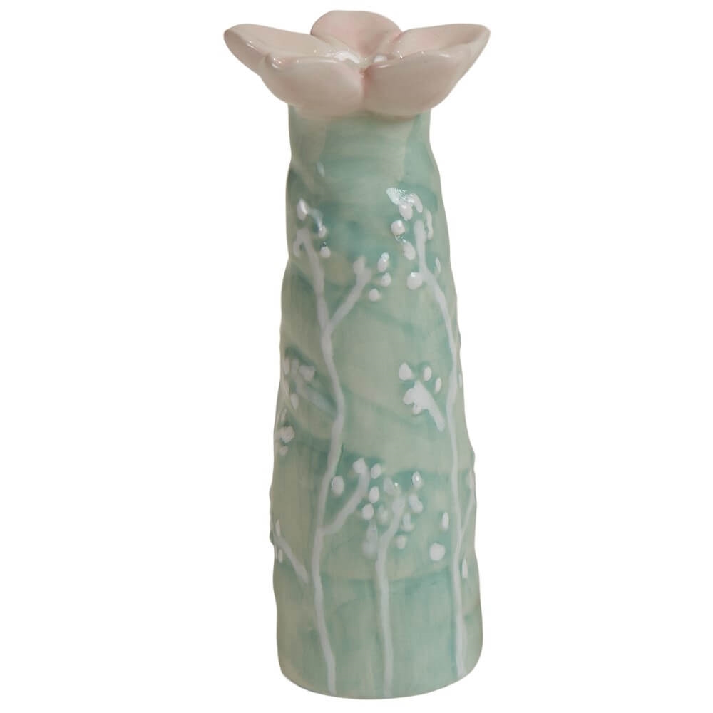 Mintgrön vas med vita blomkvistar, rosa blomformad topp och texturerad yta.